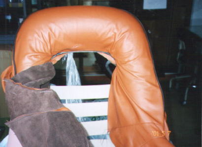 ドアーはパネルこと作成。(アルミの板で) 右は使用する皮の傷をチェックしているところ。